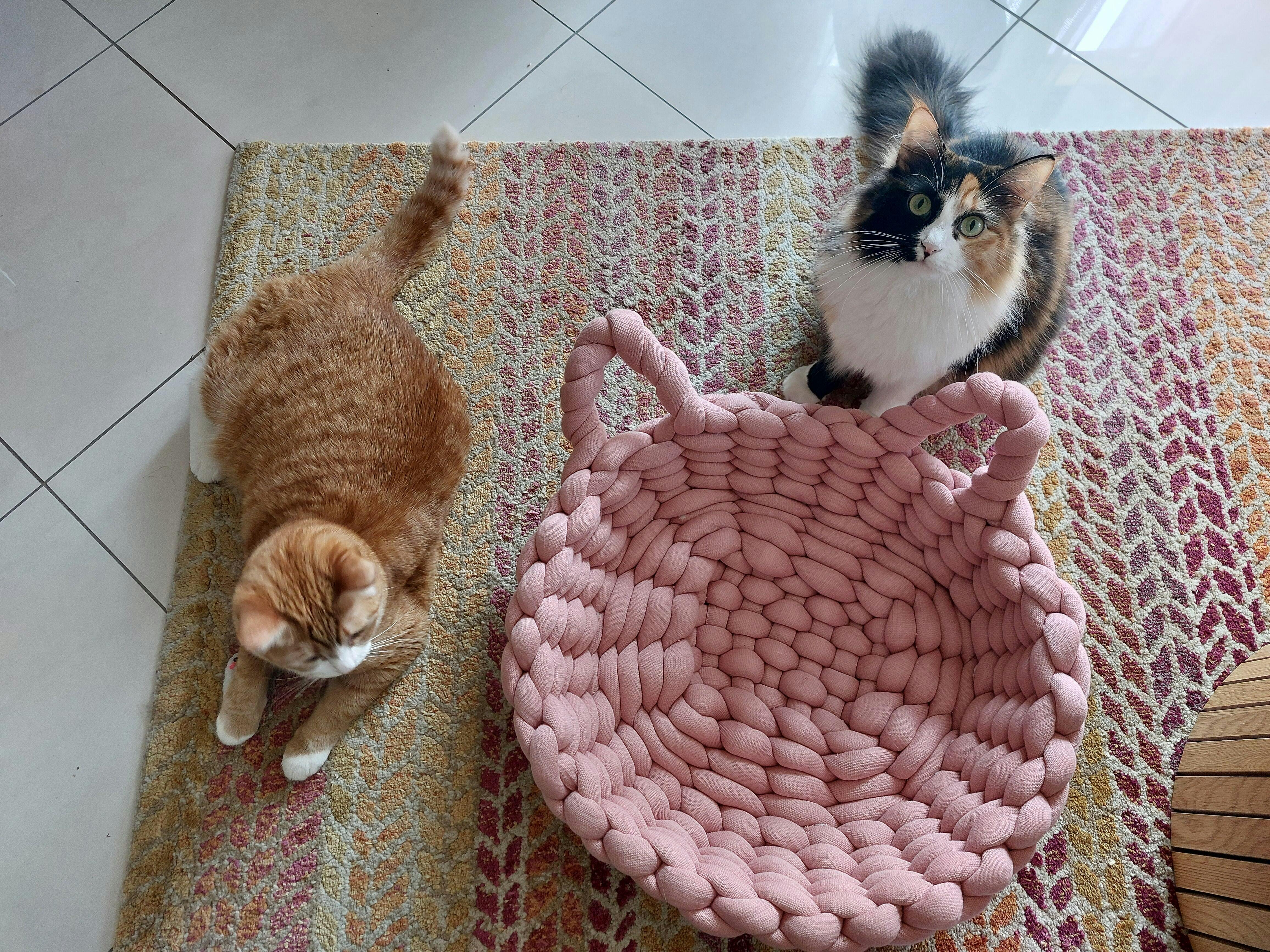 Para proyectos en los que quieras conseguir gran volumen, como cojines, colchas, alfombras, puffs, camas de gato, pero también para los bolsos XL que se están poniendo muy de moda. Su carácter voluminoso y su textura envolvente conseguirá resultados únicos. En las imágenes puedes ver ejemplos de proyectos que se han hecho con este cordón.